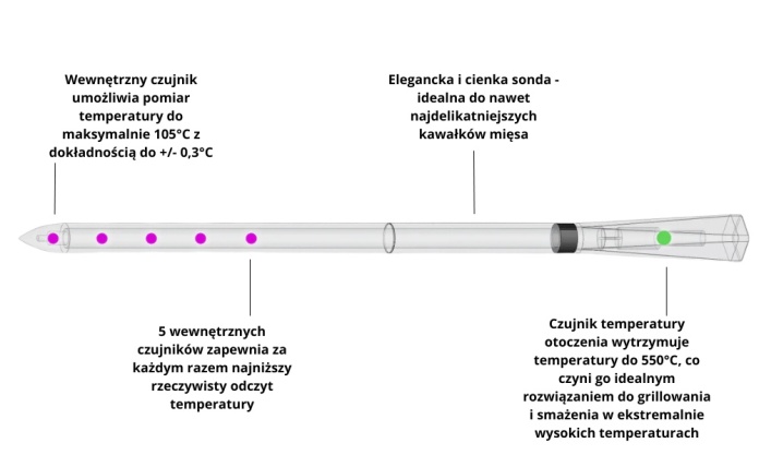 Urządzenie wyposażono w cztery sondy, z których każda posiada sześć czujników – pięć do pomiaru temperatury wewnątrz potrawy (do 105°C) oraz jeden monitorujący temperaturę otoczenia (do 550°C). Dzięki temu MEATER PRO XL umożliwia jednoczesne monitorowanie kilku kawałków mięsa lub różnych części pieczeni. Technologia Smart Temp Multisensor ustala najniższą rzeczywistą temperaturę w mięsie, pozwalając na osiągnięcie perfekcyjnych rezultatów za każdym razem. MEATER PRO XL oferuje wyjątkową wszechstronność i sprawdza się w różnych warunkach – od grillowania na gazie, węglu czy pellecie, przez pieczenie w piekarniku, smażenie w głębokim oleju, aż po gotowanie w air fryerach.